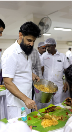 இதனைத் தொடர்ந்து சென்னை கிண்டி ரேஸ்கோர்ஸ் மைதானத்தின் வளாகத்தில் உள்ள கலையரங்கத்திற்கு வருகை தந்த 500-க்கும் மேற்பட்டவர்களை சீயான் விக்ரம் வரவேற்றார். பின்னர் படத்தில் கடுமையாக உழைத்ததற்காக அங்கு வருகை தந்த அனைவருக்கும் முதலில் தம்முடைய நன்றியை தெரிவித்தார் சீயான் விக்ரம். இதற்கு முன் ‘தங்கலான்’ படக்குழுவினருக்கு மிகவும் பிடித்த உணவு வகைகளை சீயான் விக்ரம் அவர்களிடமே கேட்டு அறிந்து தேர்வு செய்து, அந்த உணவு வகைகளை தன்னுடைய நன்றியினை தெரிவிக்கும் வகையில் படத்தில் பணியாற்றிய அனைவருக்கும் மற்றும் அவர்களது குடும்ப உறுப்பினர்களுக்கும் தனது கையாலேயே உணவினை பரிமாறினார் சீயான் விக்ரம்.