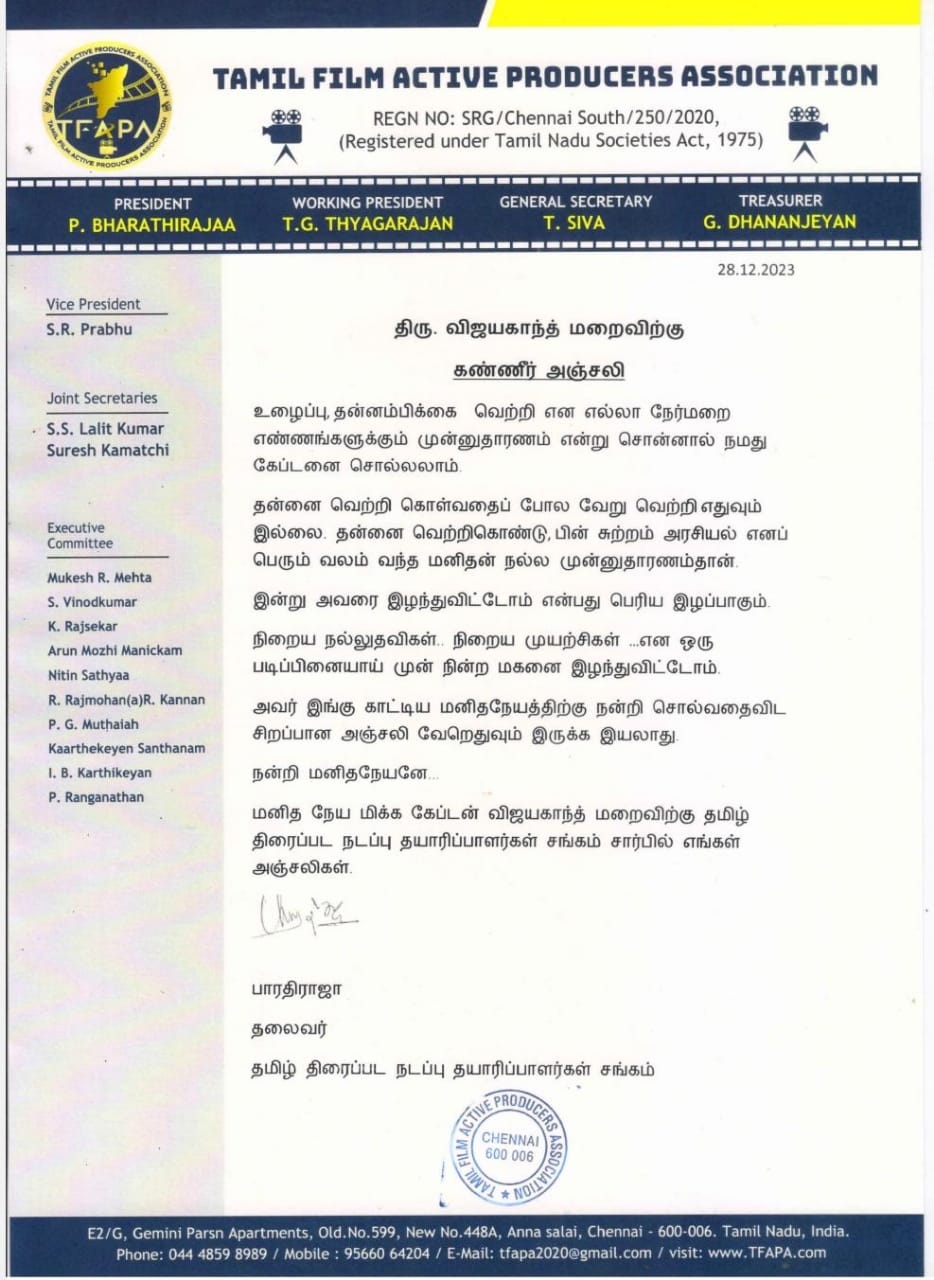 மனித நேய மிக்க கேப்டன் விஜயகாந்த் மறைவிற்கு தமிழ் திரைப்பட நடப்பு தயாரிப்பாளர்கள் சங்கம் சார்பில் எங்கள் அஞ்சலிகள்.