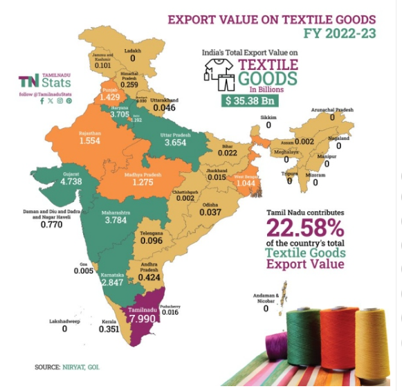 அடுத்து ஜவுளி ஏற்றுமதி. அதிலும் தமிழ்நாடுதான் பெருமைப்படும் அளவுக்கு முன்னோடி மாநிலம். தமிழ்நாடு ஜவுளி ஏற்றுமதியில் இந்திய அளவில் அதிகார மையமாகத் திகழ்ந்துவருகிறது. நாட்டின் மொத்த ஏற்றுமதி மதிப்பில் குறிப்பிடத்தக்க அளவு, அதாவது 22.58% பங்களிப்பு செய்துவருகிறது.