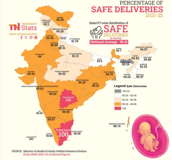 இதனிடையே, NitiAayog அறிக்கையின்படி பீகார், மேகாலயா மற்றும் உத்தரப்பிரதேசம் ஆகிய மூன்று மாநிலங்களில் தாய்வழி பராமரிப்பு என்பது மோசமாக உள்ளது தெரியவந்துள்ளது. பிரசவத்தின் போதே குழந்தை இறப்பு விகிதம் மற்றும் தாய் இறப்பு விகிதம், மேலும் 5 வயதுக்குக் கீழாக உள்ள குழந்தைகளின் இறப்பு விகிதம் ஆகியவை குறித்த இந்திய அளவில் எடுக்கப்பட்ட கணக்கெடுப்பில் தமிழ்நாடும் கேரளாவும் முன்னணியில் உள்ளன. தமிழ்நாடு 99% ஆகவும் கேரளா 100% ஆகவும் உள்ளது.
