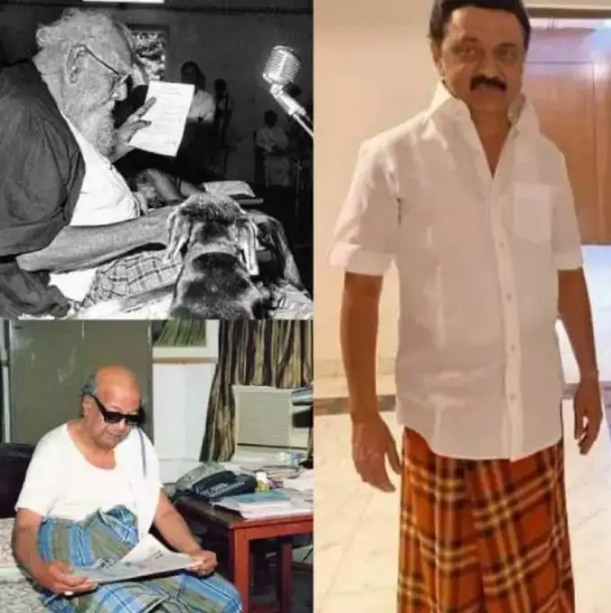 பெரியார் – கருணாநிதி – மு.க.ஸ்டாலின்முன்னாள் முதலமைச்சர் கருணாநிதி லுங்கி கட்டும் பழக்கம் உடையவர். நள்ளிரவில் கைது செய்யப்பட்ட போதுகூட அவர் லுங்கி தான் அணிந்திருந்தார். அதே போல தற்போதைய முதலமைச்சர் மு.க.ஸ்டாலின், ஓய்வு நேரத்தில் லுங்கி அணிந்து போஸ் கொடுத்த காட்சி பிரபலமானது.